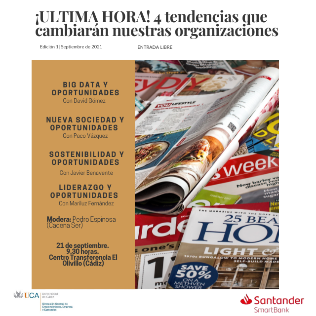 Desde la Cátedra de Emprendedores de la Universidad de Cádiz, con la financiación de Santander X, ponemos en marcha por primera vez 20 minutos sobre tendencias y oportunidades. El 21 de septiembre a las 9.30 horas os esperamos en el Centro de Transferencia Empresarial El Olivillo (Cádiz).