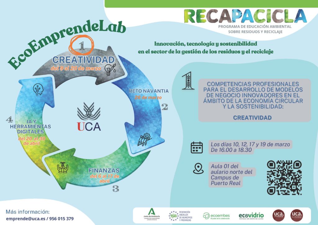 Esta actividad forma parte del programa EcoEmprendeLab (dentro de la iniciativa RECAPACICLA). No solo recibirás formación de alto nivel coordinada por expertos de la UCA, sino que conectarás con otros perfiles inquietos (alumnado, egresados y personal) con tus mismos valores.