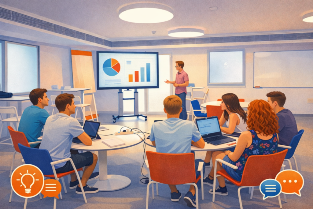 Aquí no vas a “redactar un plan eterno”: trabajarás en el mercado tanto como en el aula. Desde la primera sesión eliges un perfil/itinerario y activas microretos para aprender haciendo: