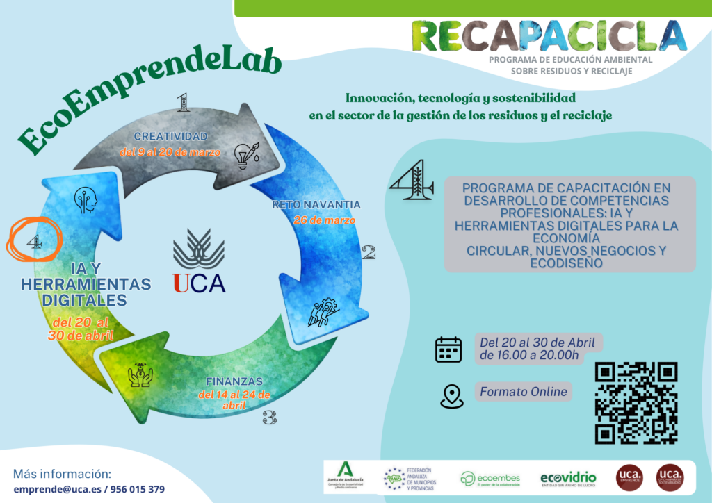 Gracias a la colaboración entre la Consejería de Sostenibilidad y Medio Ambiente, la FAMP, Ecoembes, Ecovidrio y la UCA, este programa de RECAPACICLA es totalmente gratuito. Si eres estudiante, docente, personal (PTGAS) o egresado de cualquier titulación, este es tu lugar para conectar con las competencias verdes que el mercado actual está buscando.