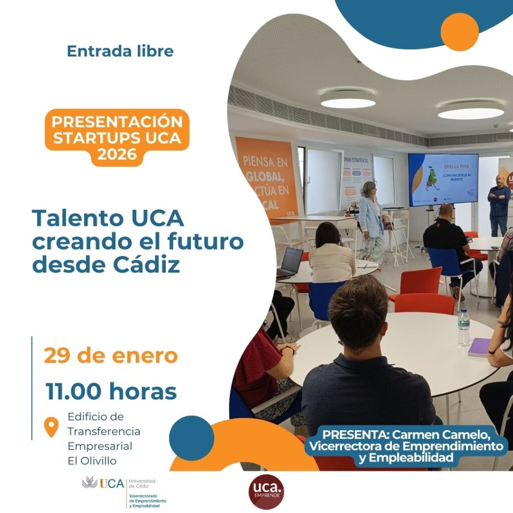 En esta Presentación Startups UCA 2026, rompemos la barrera entre «la idea» y «la realidad». No es una clase teórica; es un encuentro cercano para conocer de primera mano las iniciativas innovadoras que están naciendo en tu universidad. Contaremos con la apertura institucional de Carmen Camelo Ordaz, Vicerrectora de Emprendimiento y Empleabilidad, y Jose Manuel Sánchez Vázquez, Director General de Emprendimiento, quienes reafirmarán el compromiso de la UCA con vuestro futuro.