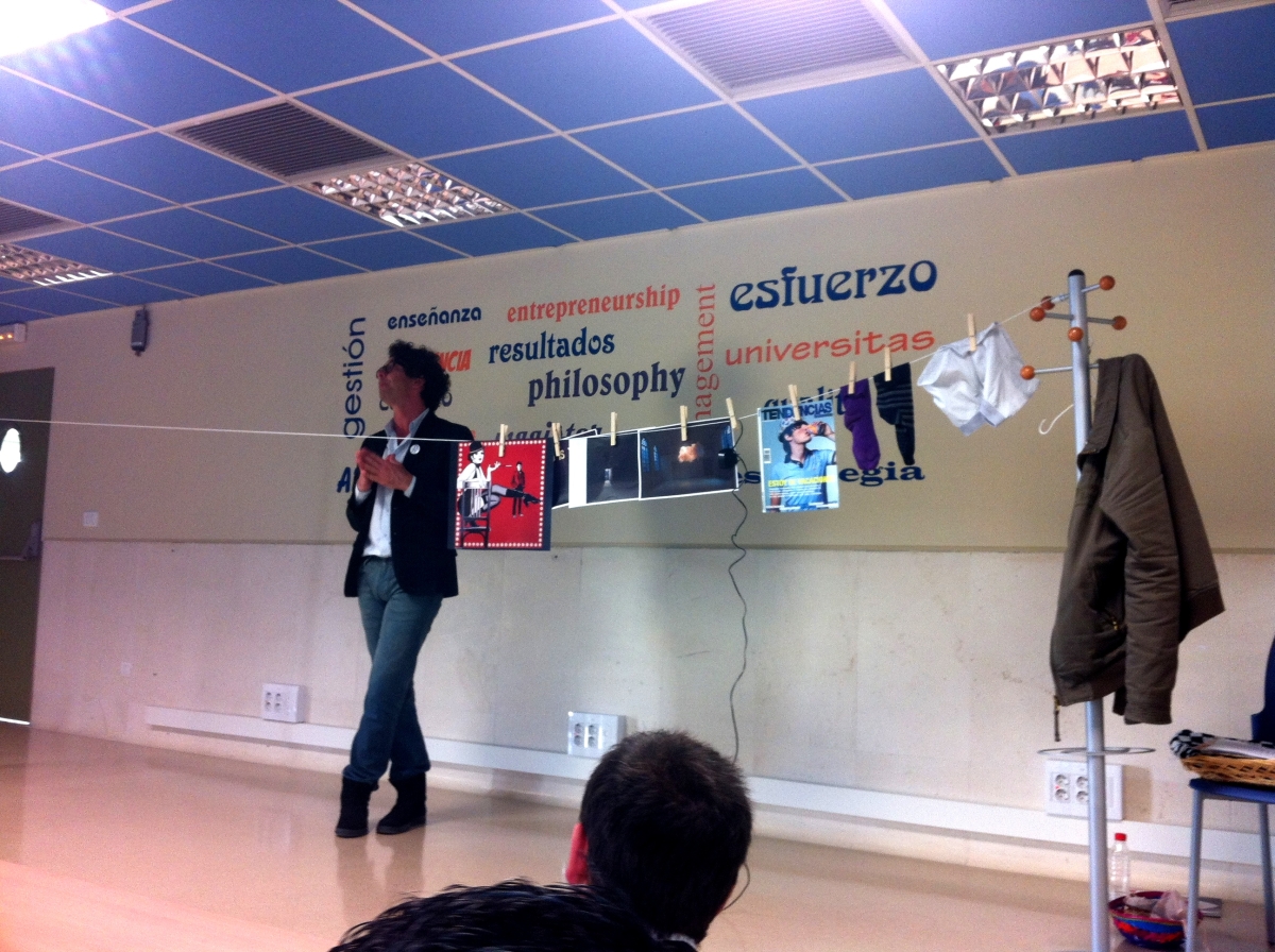 En aquel taller nos ofreció un A3 para que escribiésemos en el centro la palabra que mejor nos definiera y la utilizáramos para presentarnos a los demás. Durante el transcurso del taller, fuimos añadiendo al A3 todo aquello que nos parecía relevante para nosotros, creando al final un mosaico personal de ideas, consejos y experiencias que nos servían como mapa vital y profesional. El colofón del taller fue una situación de lo más bonita: cada uno de nosotros escribimos una palabra con la que nos identificásemos y la metimos en un globo, el cual llenamos y esparcimos por la sala. Posteriormente, cada uno explotó un globo y cogió el papel que había en su interior para leerlo. Así, podíamos escuchar en labios de otra persona la palabra con la que nos sentíamos identificados, provocando un clima de bienestar y emoción que rompió con un gran aplauso por parte de todos.