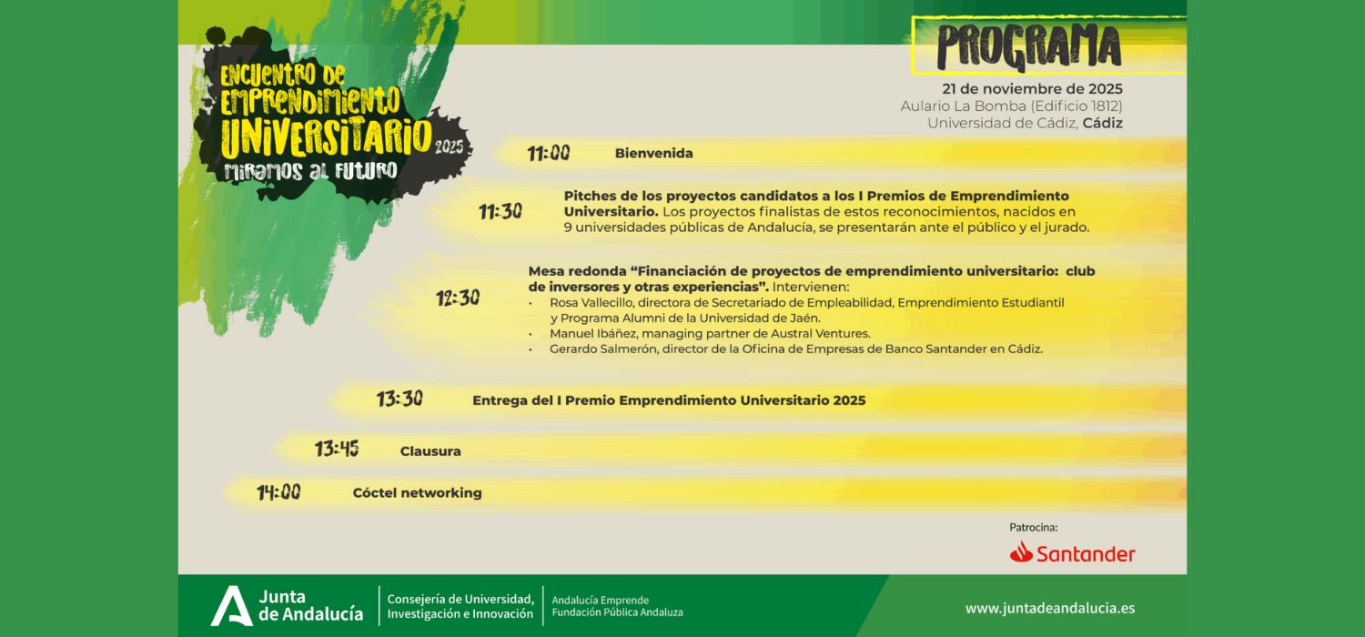 Asimismo, el Encuentro de Emprendimiento Universitario, que se celebrará el día 21, será una de las citas estratégicas de la semana. Este evento, organizado por la Consejería de Universidad a través de Andalucía Emprende, con la colaboración de la UCA, reunirá a más de 150 personas en el Edificio Constitución 1812. Según Andrés Valverde, secretario general de la Consejería de Universidad, Investigación e Innovación de la Junta de Andalucía, “será un encuentro donde tendrán cabida las diez universidades públicas andaluzas; un punto de conexión entre empresa, universidad y emprendimiento”.